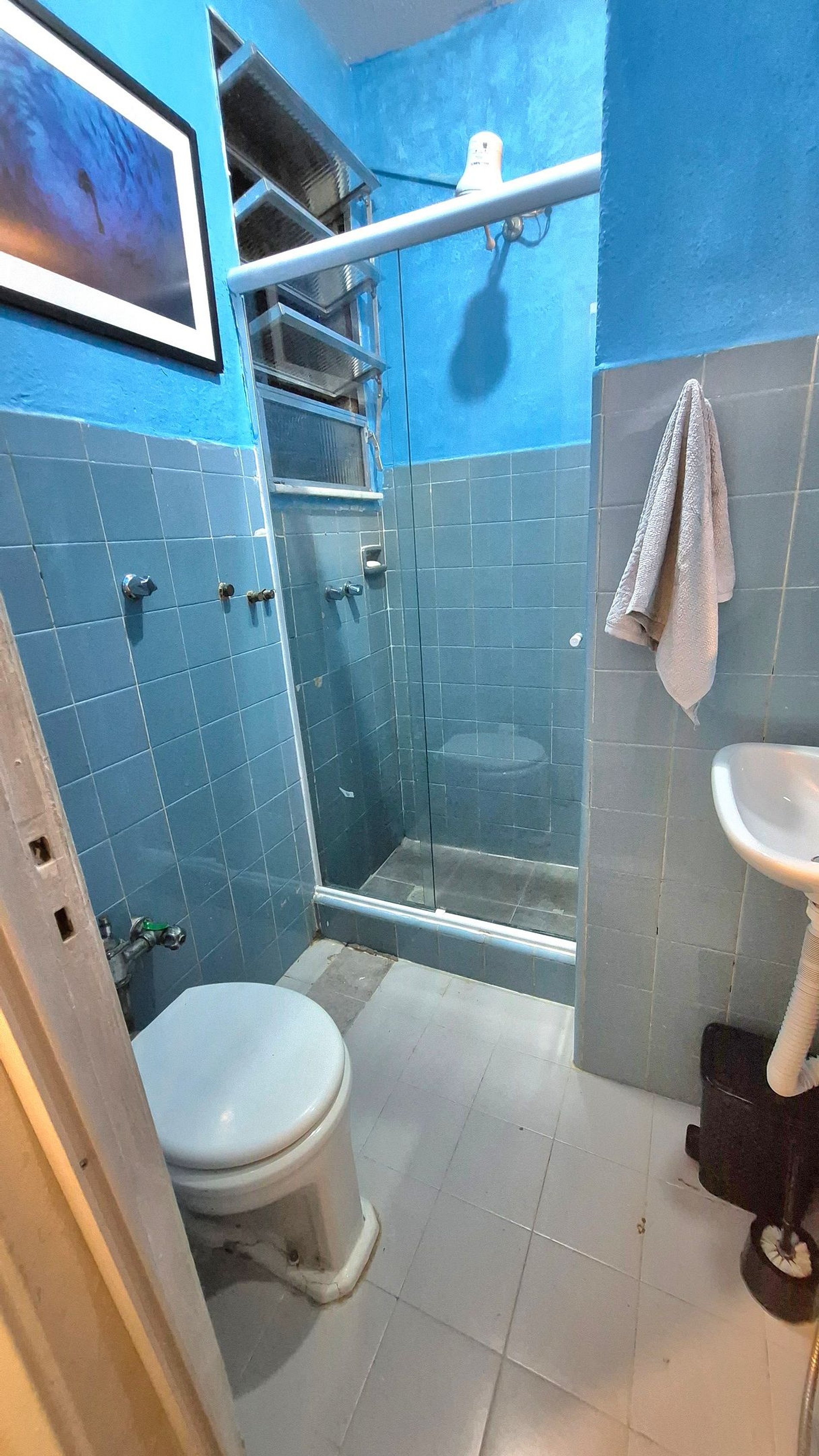 Quiet studio apartment with plenty of privacy, just one block from Copacabana beach, near Post 2. Features include a double bed, wardrobes, television, air conditioning, and a small dining table. Compact kitchenette with mini-fridge, stove, and microwave. Full bathroom with shower and hot water. High-speed internet with Wi-Fi. 24-hour concierge service.
