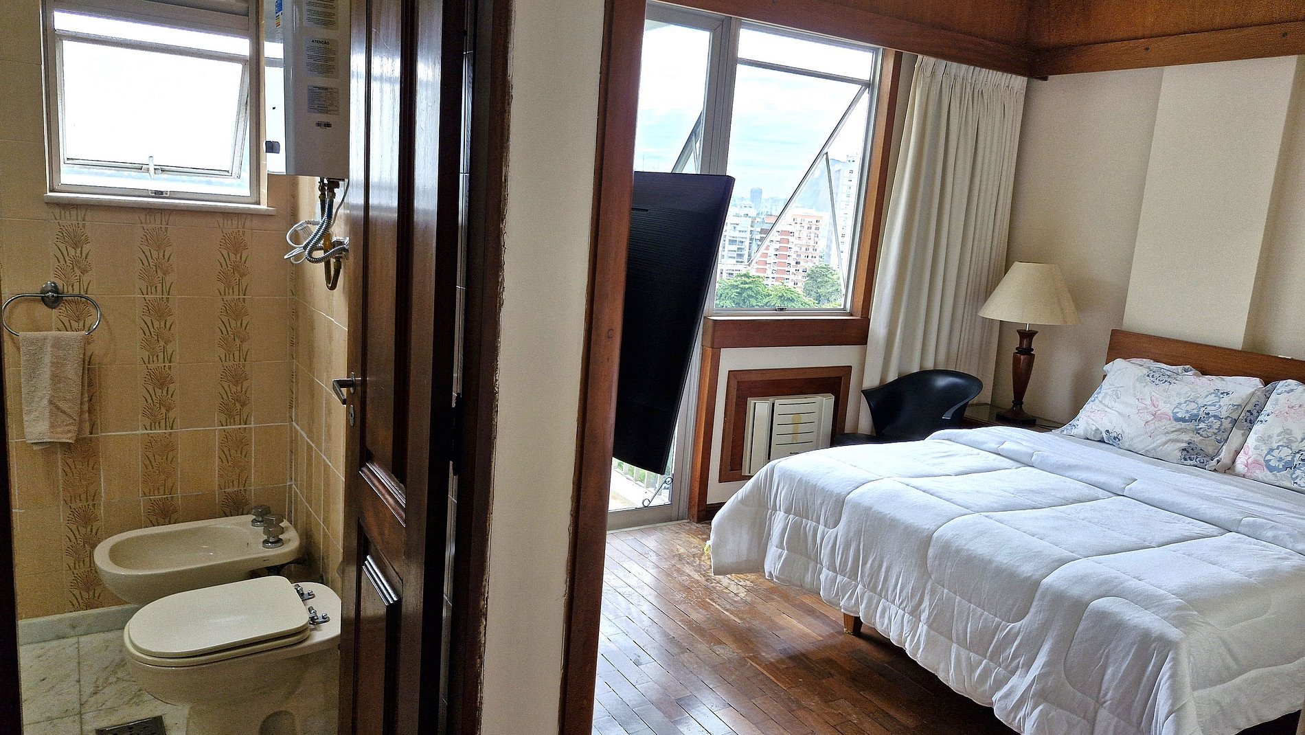Roomy apartment in the gastronomic center of Leblon. There are 3 bedrooms and 2 complete bathrooms, one suite + toilet. Living room with sofa, armchairs, air conditioning and TV. Dining table for 6 people. Balcony with a beautiful view. Well-equipped kitchen with washing machine in the laundry area. Air conditioning in 3 bedrooms. TV in the suite, in the second bedroom and in the living room. High speed internet with WIFI. 24 hour concierge