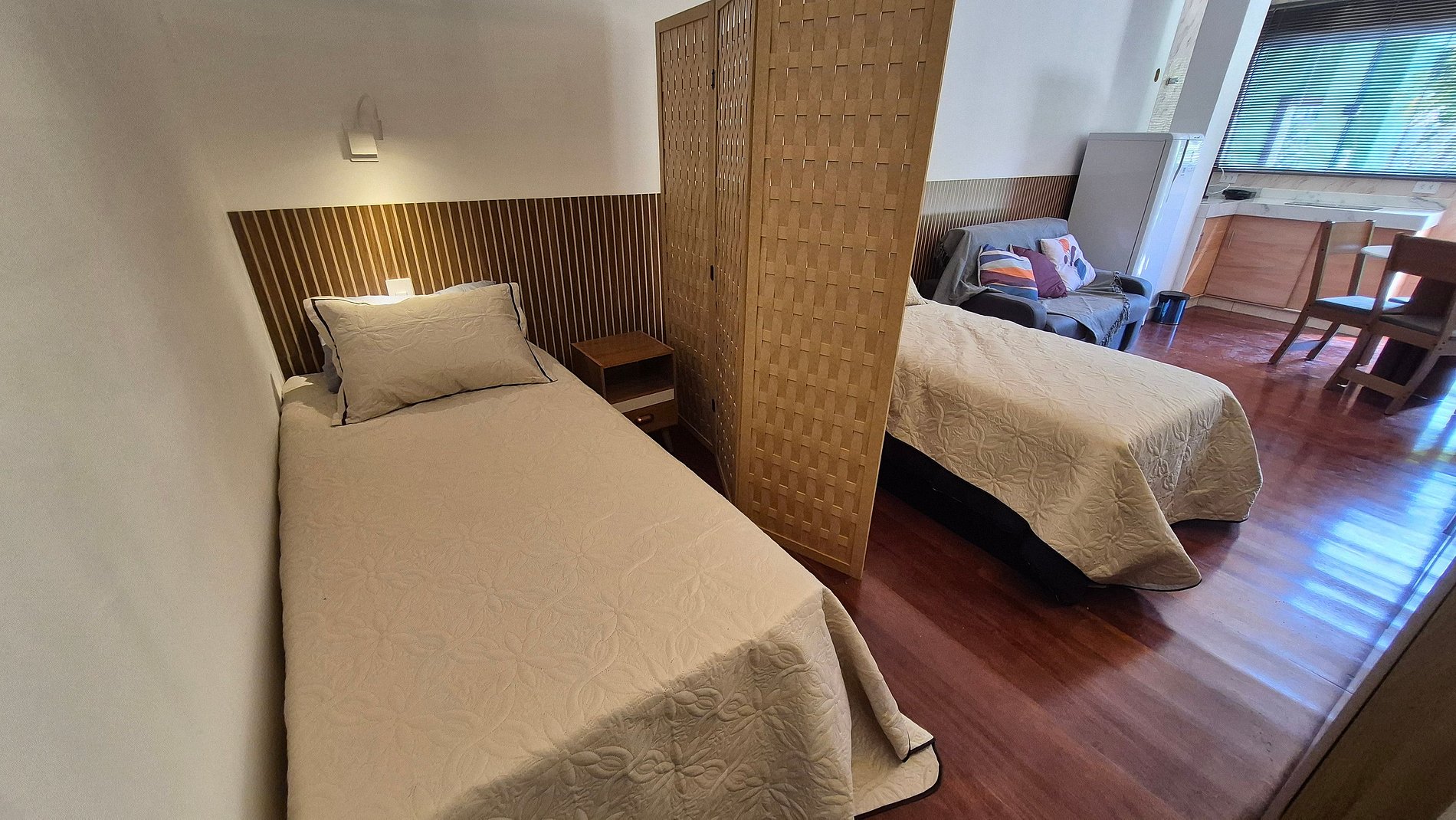 Apartment with 2 single beds, air conditioning, wardrobes, a table for studying or dining, smart TV, Wi-Fi, and a kitchenette. A sofa bed is also available to accommodate a third guest.