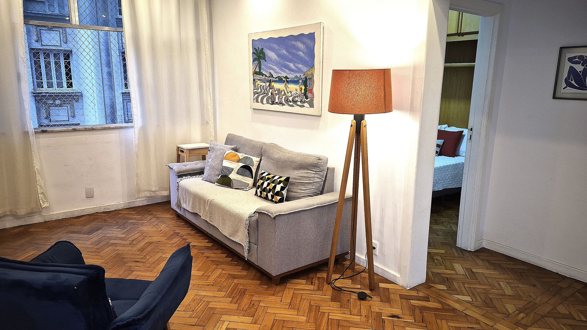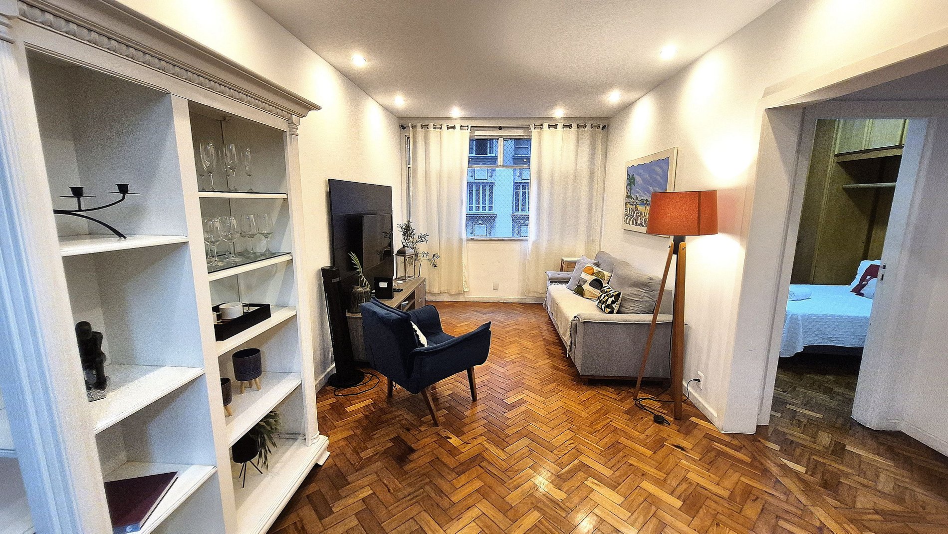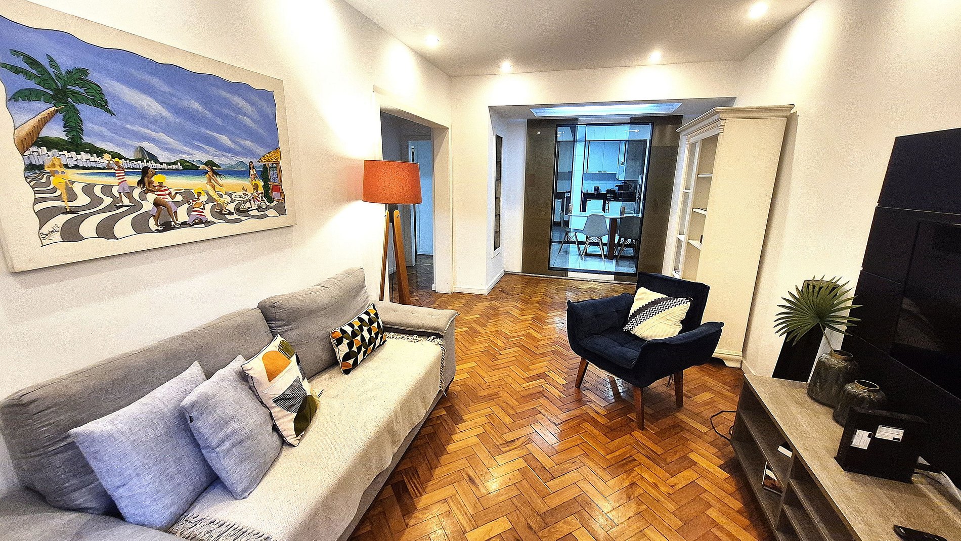 Comfort and privacy for groups of up to 6 people. Copacabana beach is just a few steps from the building. We have 3 bedrooms, 2 full bathrooms + 1 toilet. The suite has a double bed, closet and air conditioning. The second bedroom has a double bed, closet and air conditioning. The third bedroom has 2 single beds + a work or study table and air conditioning. Living room with flat screen TV, sofas and armchair. Dining room with table that comfortably seats 6 people.