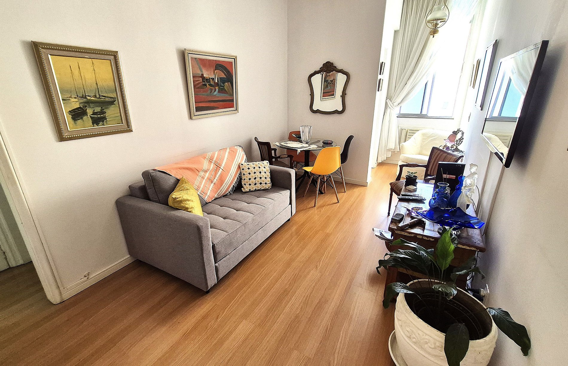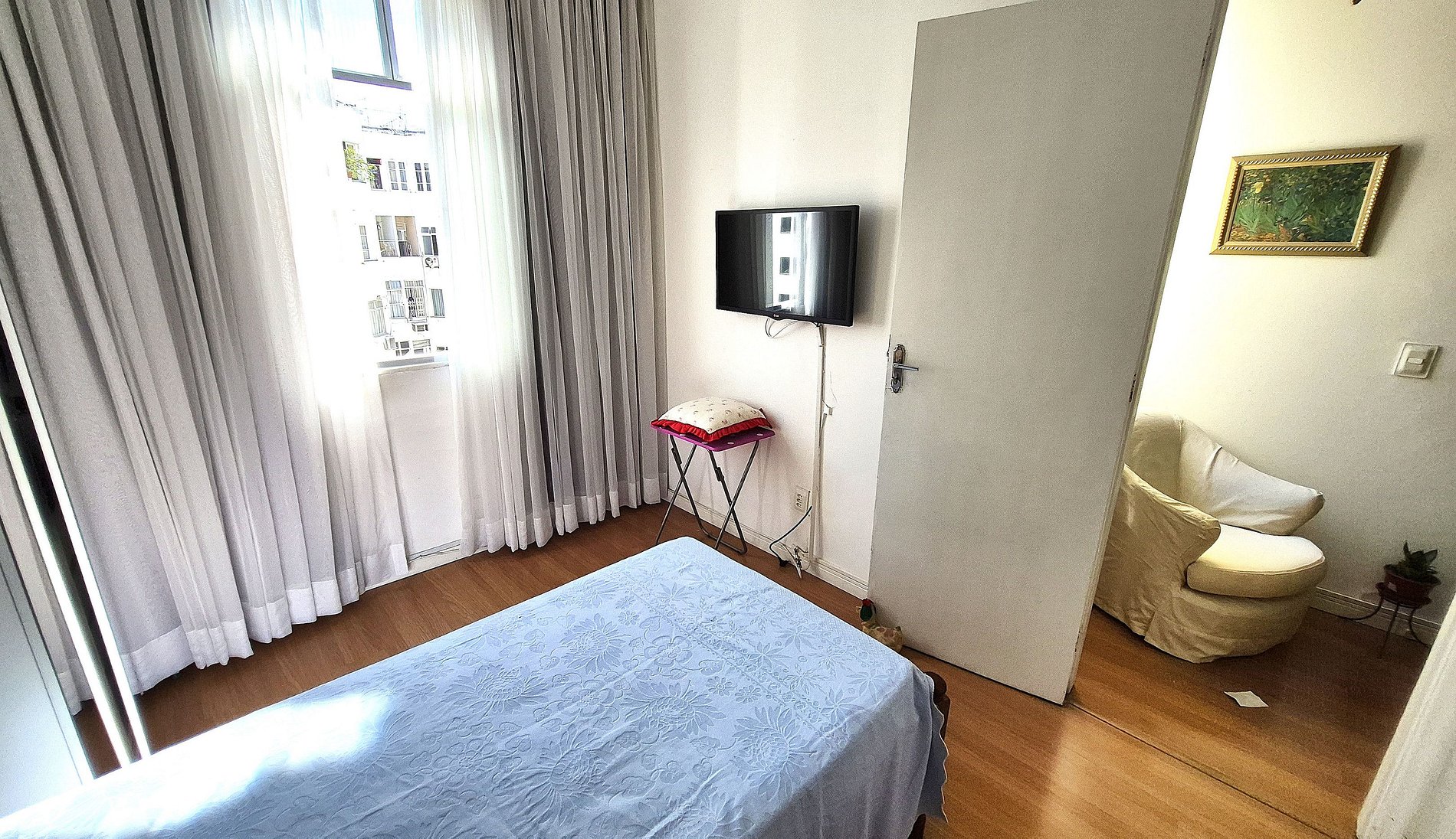 Comfortable apartment for up to 4 people. Living room with TV, air conditioning, sofa bed and dining table with 4 chairs. Two bedrooms, the first with a double bed + smart TV, built-in closet and air conditioning. Second bedroom with single bed and closet. Full bathroom with gas heating. Well-equipped kitchen with breakfast table. We also have a half bathroom in the service area and a pantry. High-speed Internet with WIFI. 24-hour doorman