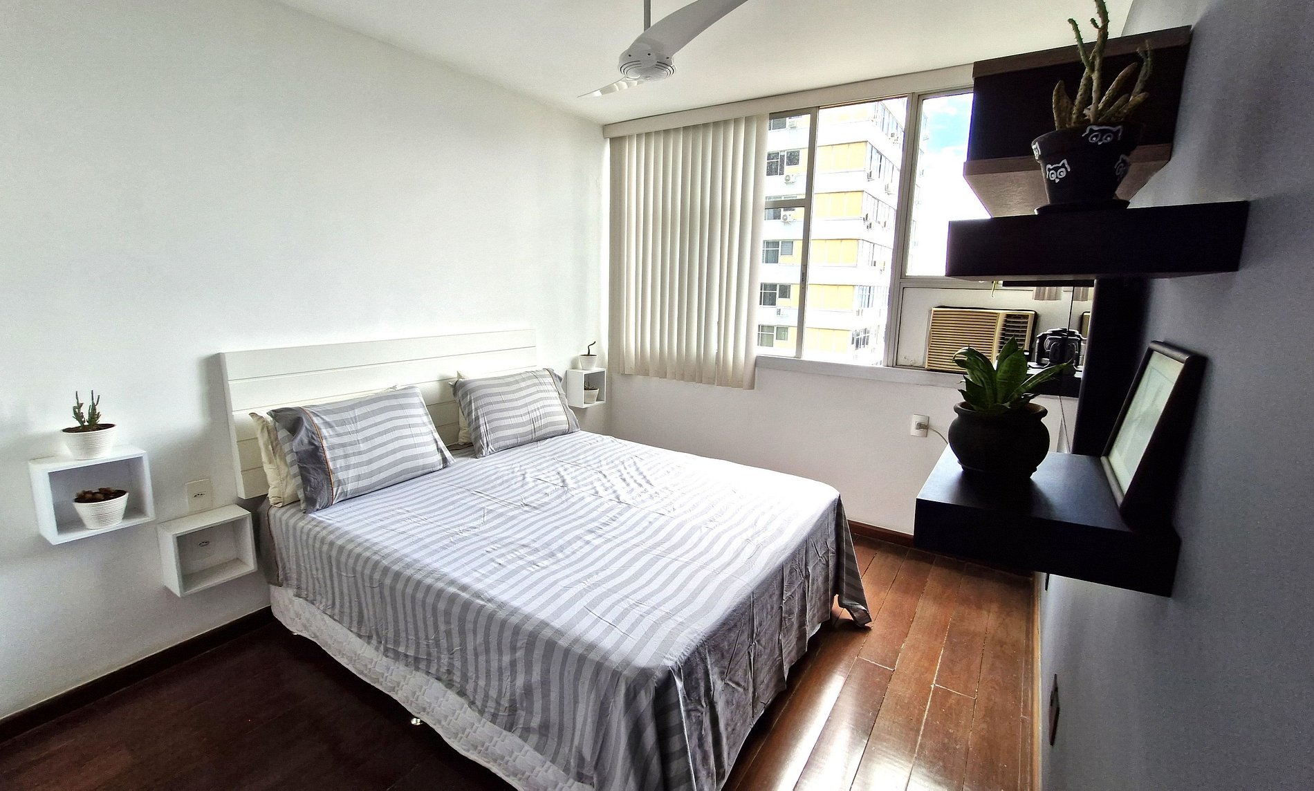 Amplio apartamento en Morada do Sol, frente al centro comercial Rio Sul. Hermosas vistas a la Bahía de Guanabara y Urca. Salón con sofá, TV y despacho. Suite con cama doble, aire acondicionado y ventilador de techo. Disponemos de un segundo baño completo en el pasillo, frente al despacho. Cocina bien equipada, con estufa, horno y refrigerador. Internet de alta velocidad con wifi. Edificio seguro con conserje las 24 horas. Aparcamiento para 1 coche.