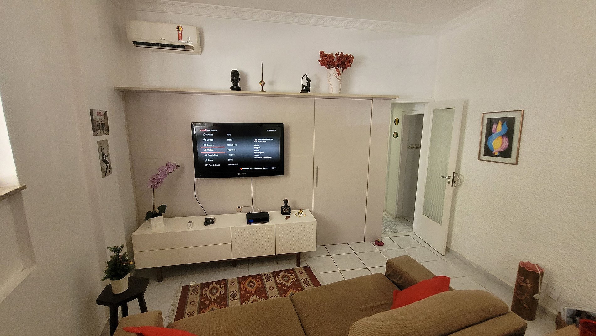 Acogedor apartamento a solo dos cuadras de la playa de Copacabana, altura post 06. Dormitorio con cama doble, armarios empotrados y aire acondicionado. Sala de estar con sofá, TV de pantalla plana con canales por cable, comedor y aire acondicionado. Baño completo con golosinas en la ducha. Cocina completa y bien equipada. Arado de servicio con tanque. Internet de alta velocidad con wifi.