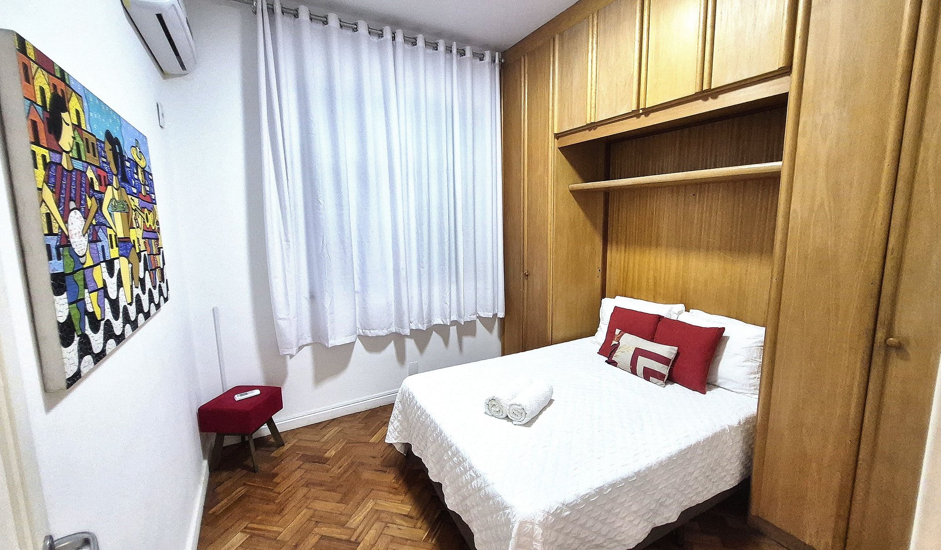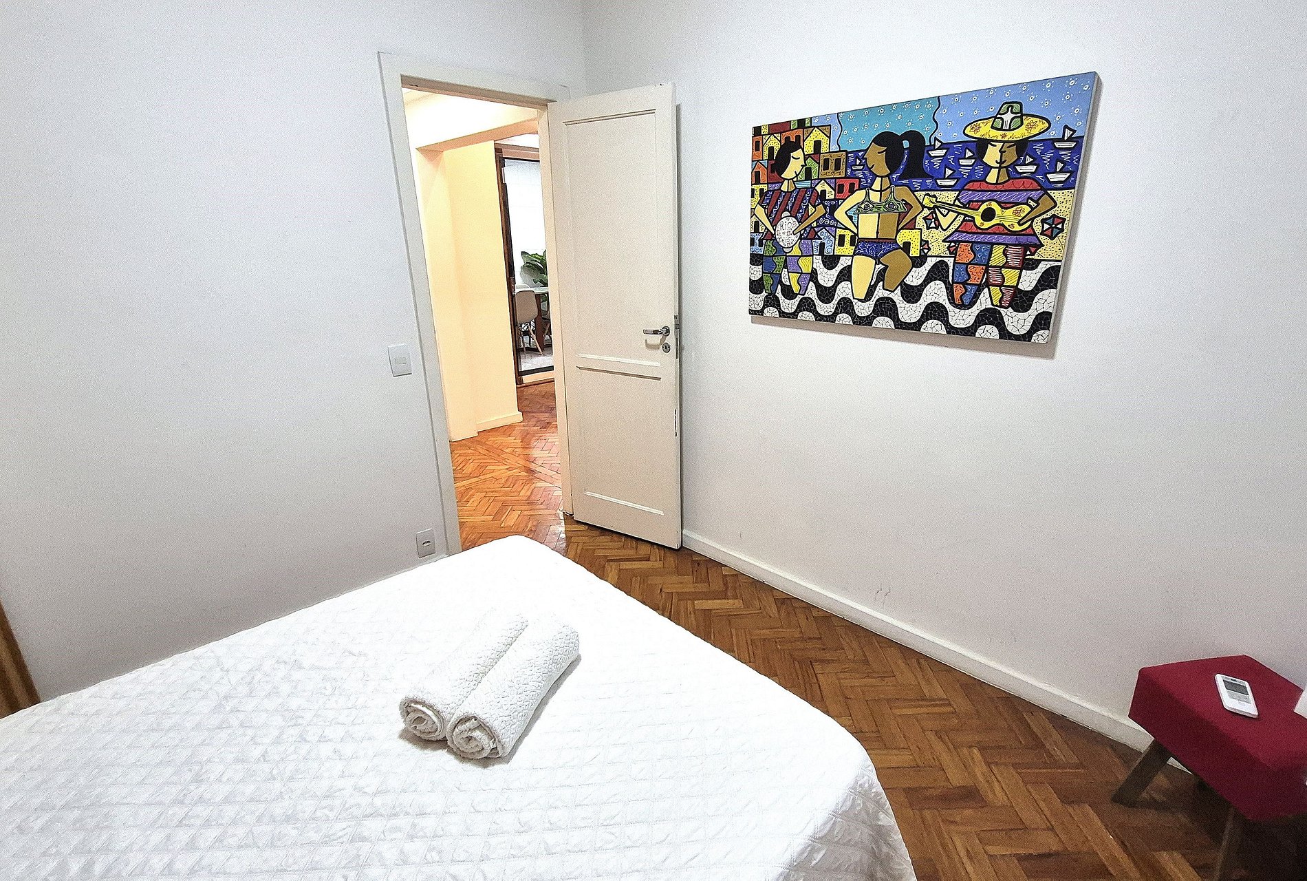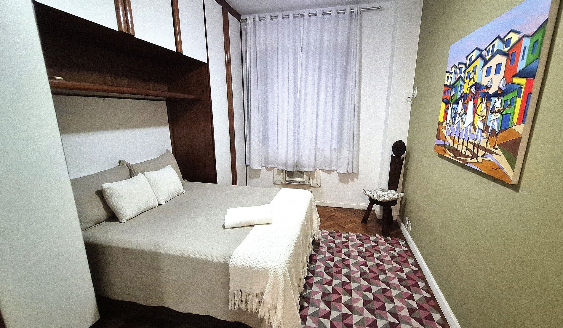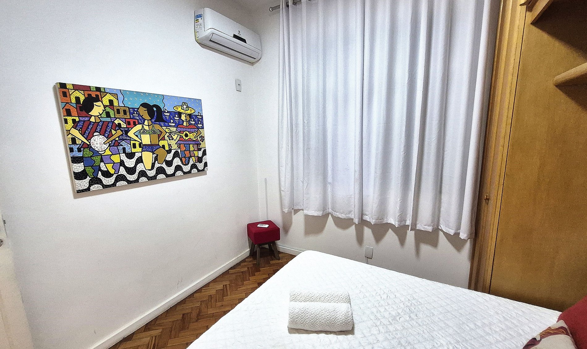 Comodidad y privacidad para grupos de hasta 6 personas. La playa de Copacabana está a solo unos pasos del edificio. Disponemos de 3 dormitorios, 2 baños completos y 1 aseo. La suite cuenta con una cama doble, armario y aire acondicionado. El segundo dormitorio también cuenta con una cama doble y aire acondicionado. El tercer dormitorio cuenta con 2 camas individuales, una mesa de estudio o trabajo y aire acondicionado.
