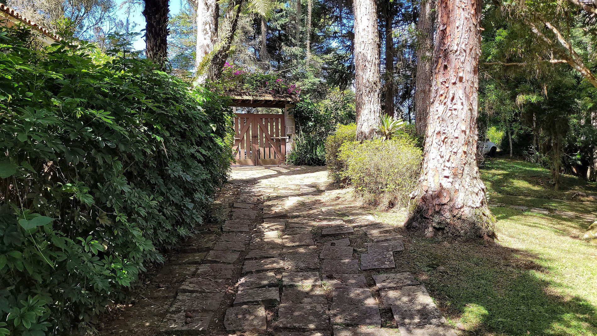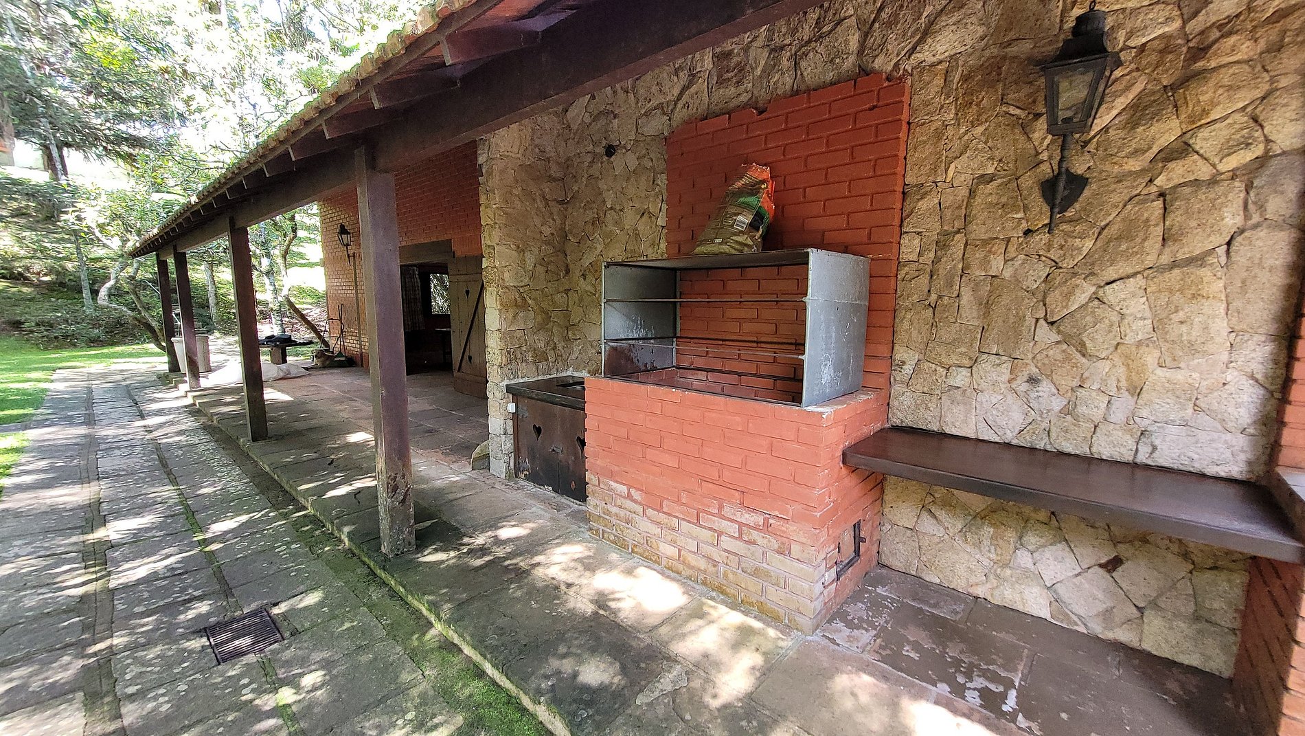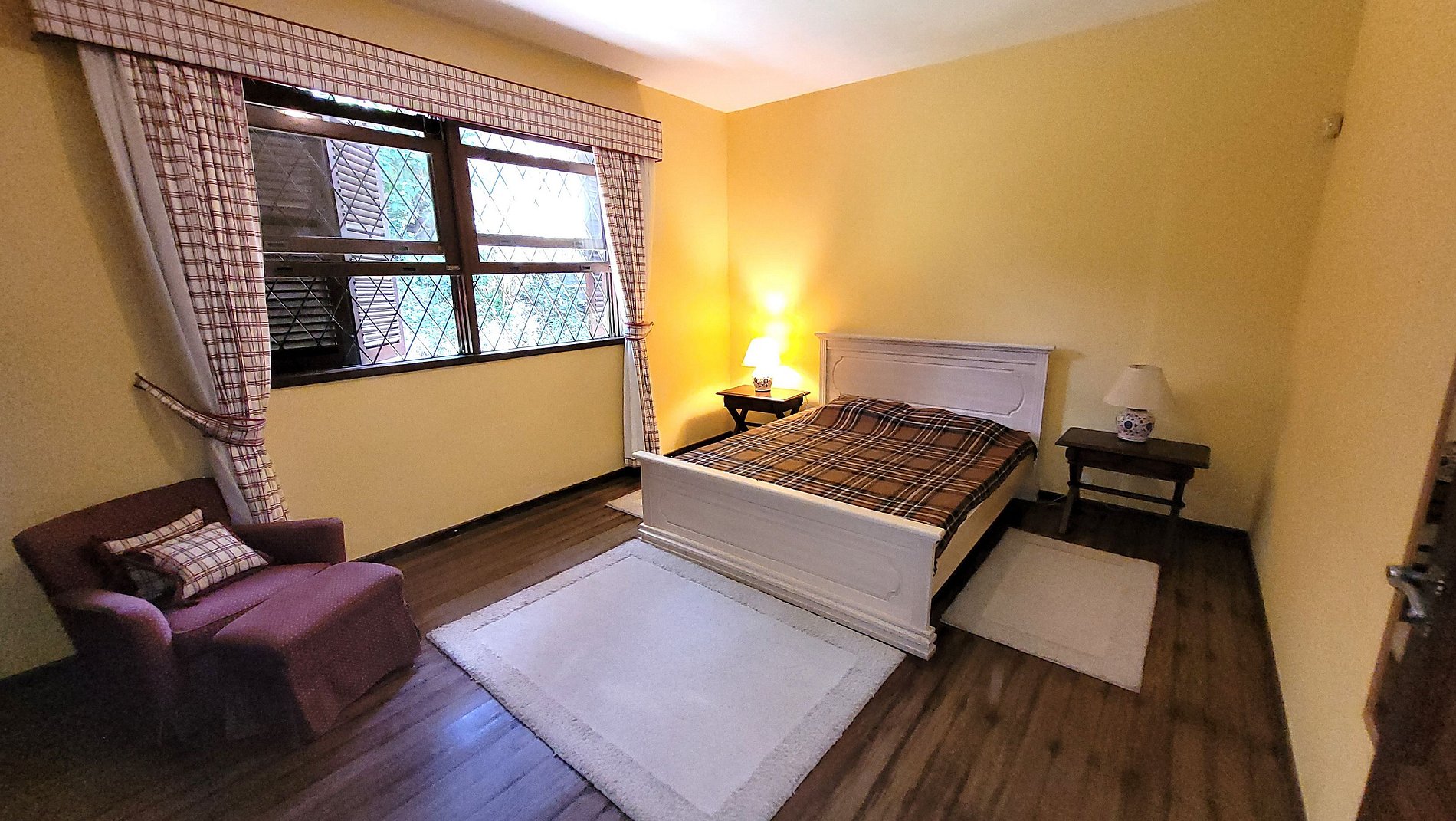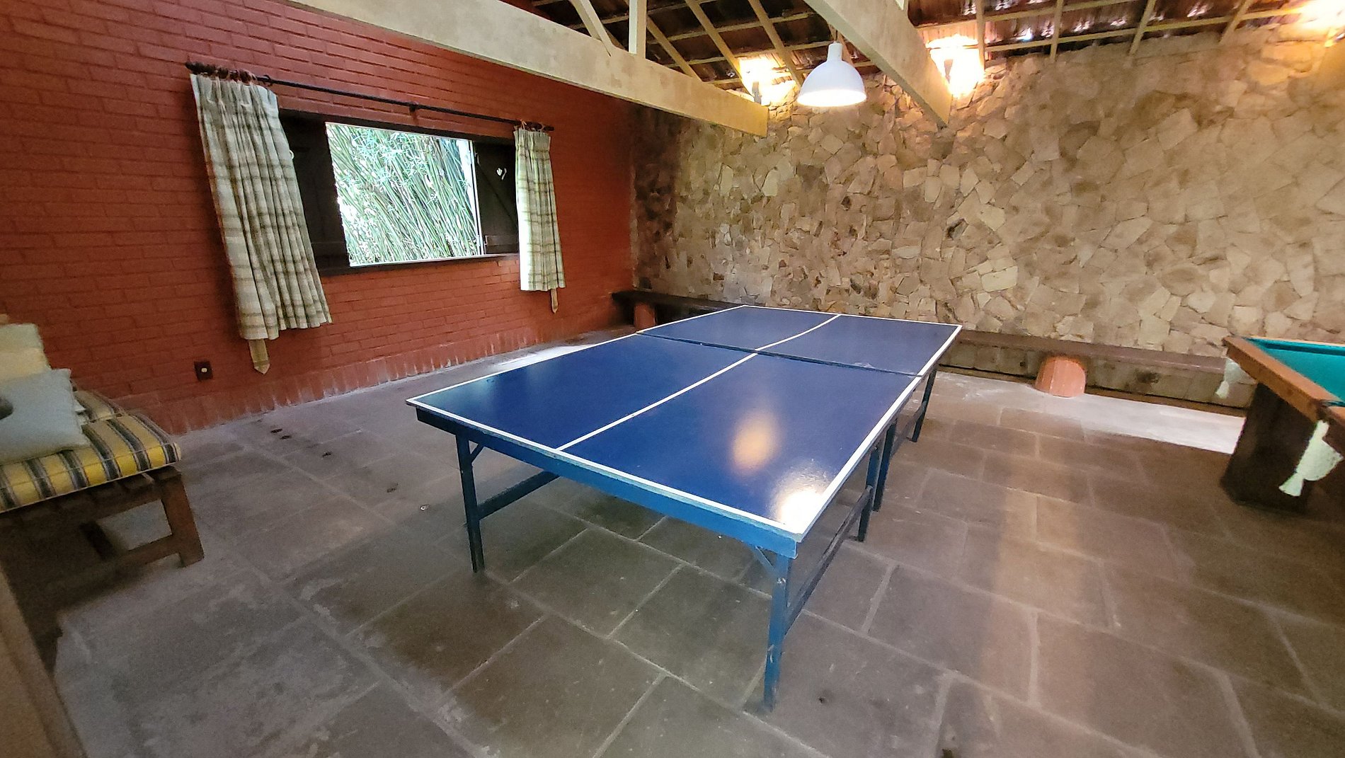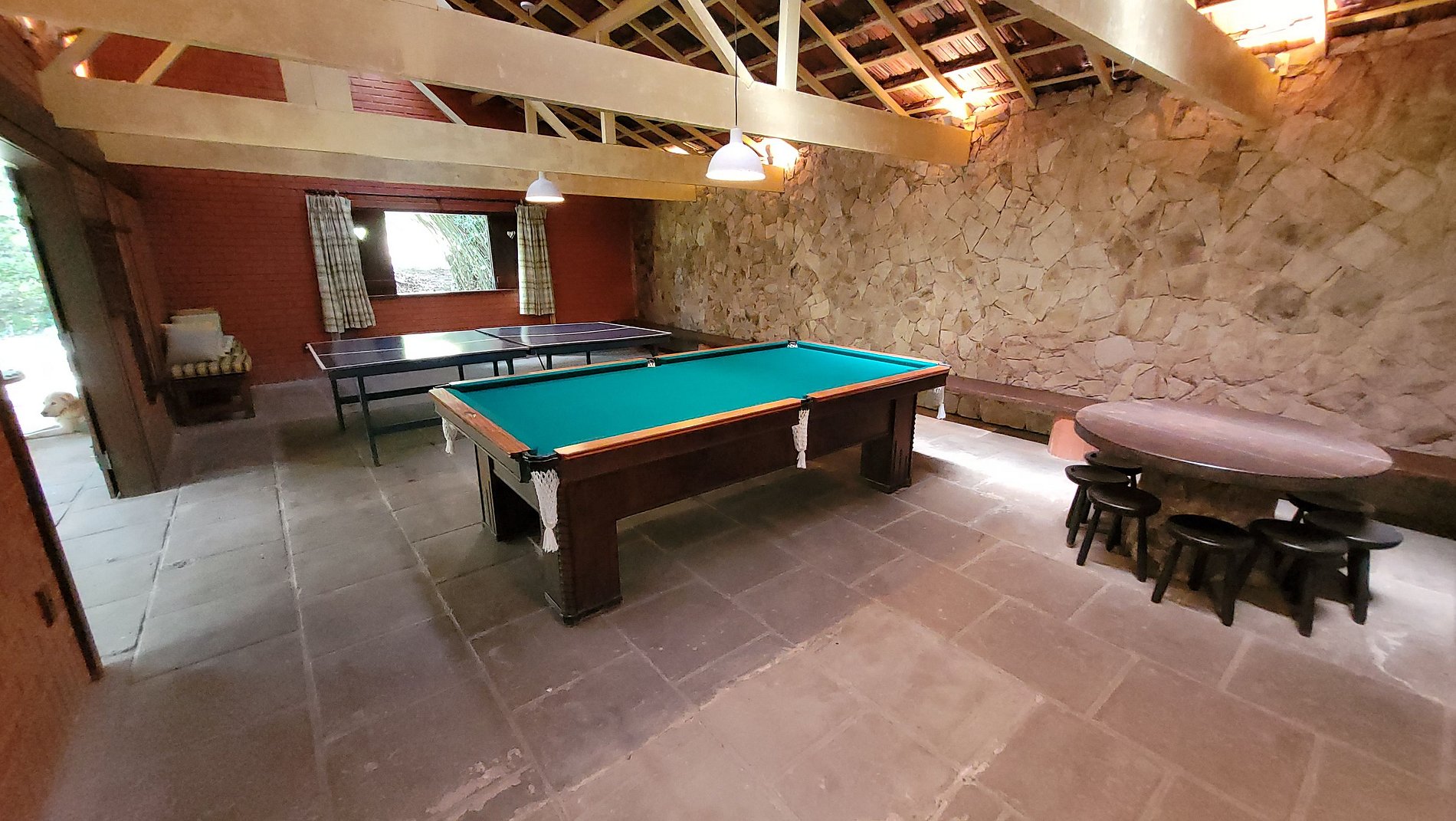 Casa com piscina, cercada de muito verde. Temos 4 quartos que acomodam bem até 11 pessoas. São 2 suites com camas de casal, mais 2 quartos com 1 banheiro em comum. Sala ampla, com lareira e um espaço com poltronas confortáveis dispostas de frente para uma TV de tela plana. Sala de jantar que pode acomodar até 10 pessoas. Cozinha ampla e bem equipada. Area de serviço com maquina de lavar roupas. No jardim temos uma bela piscina, que fica próxima ao salão de jogos, sauna e churrasqueira.