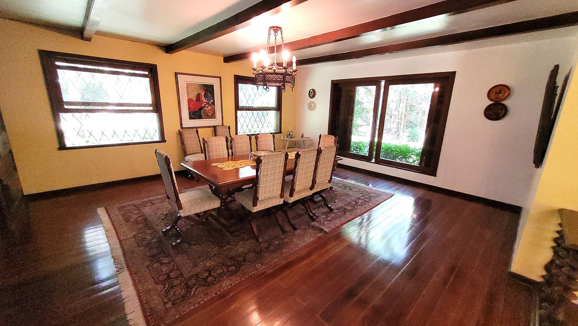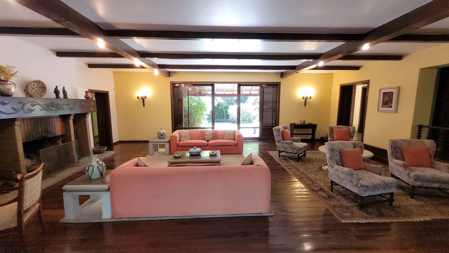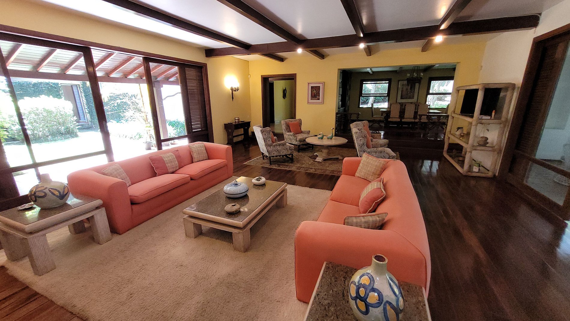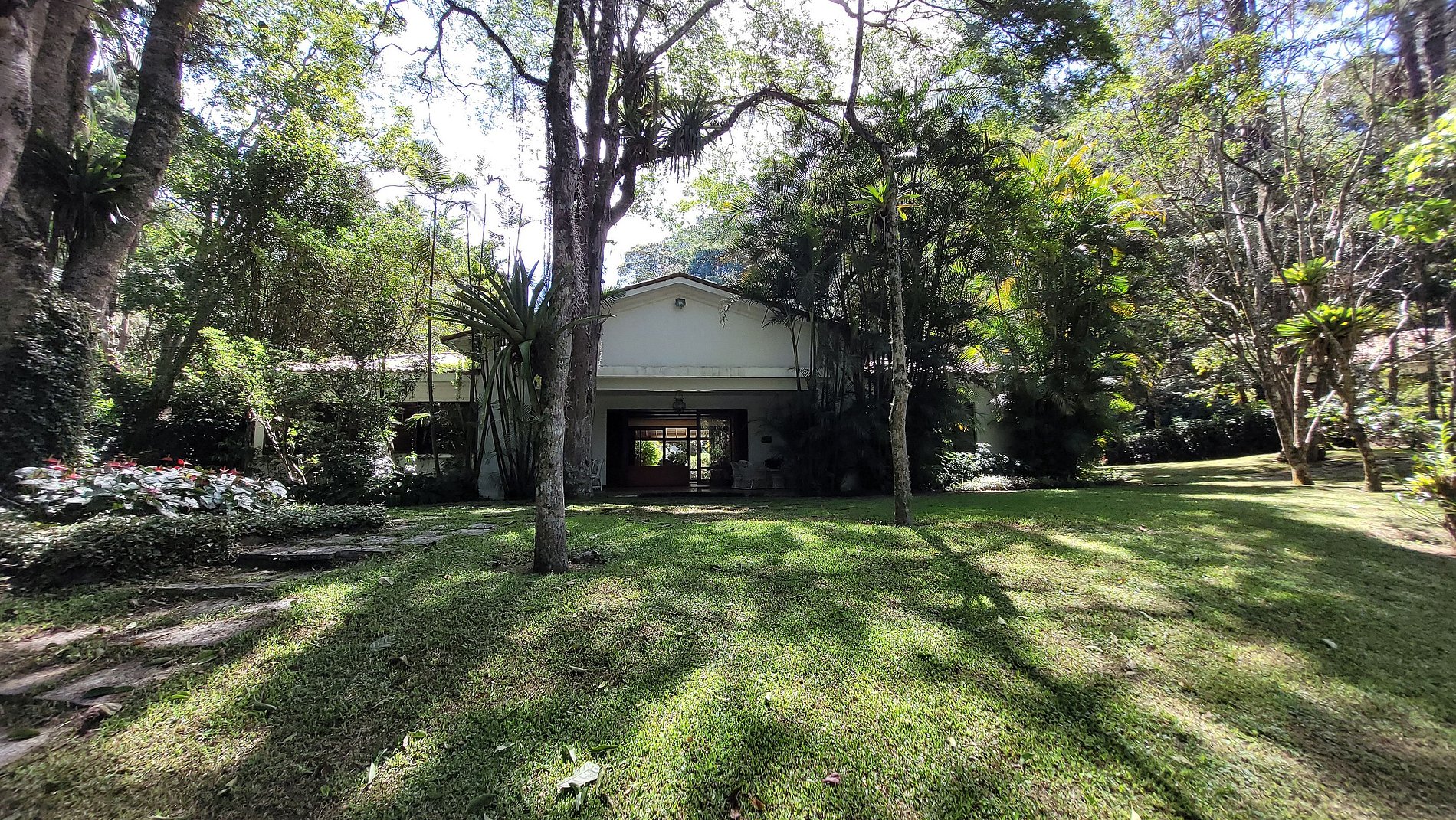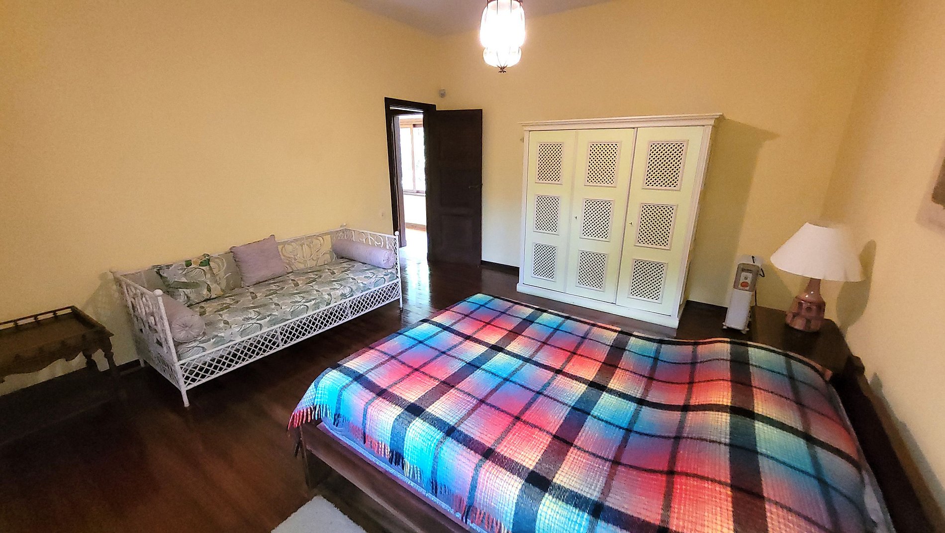 Casa com piscina, cercada de muito verde. Temos 4 quartos que acomodam bem até 11 pessoas. São 2 suites com camas de casal, mais 2 quartos com 1 banheiro em comum. Sala ampla, com lareira e um espaço com poltronas confortáveis dispostas de frente para uma TV de tela plana. Sala de jantar que pode acomodar até 10 pessoas. Cozinha ampla e bem equipada. Area de serviço com maquina de lavar roupas. No jardim temos uma bela piscina, que fica próxima ao salão de jogos, sauna e churrasqueira.