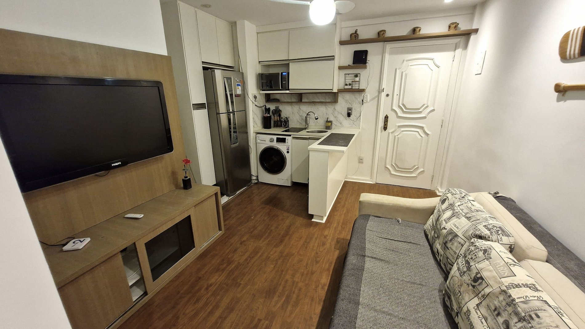 Apartamento de quarto e sala, localizado na Rua Olegário Maciel, apenas 2 quadras da praia da Barra. Suite com cama de casal, armario embutido, ar condicionado e banheiro renovado. Sala com sofá cama, mesinha para refeições, TV e cozinha americana integrada. Internet de alta velocidade com wifi. Maquina de lavar roupas. Garagem para 1 carro.