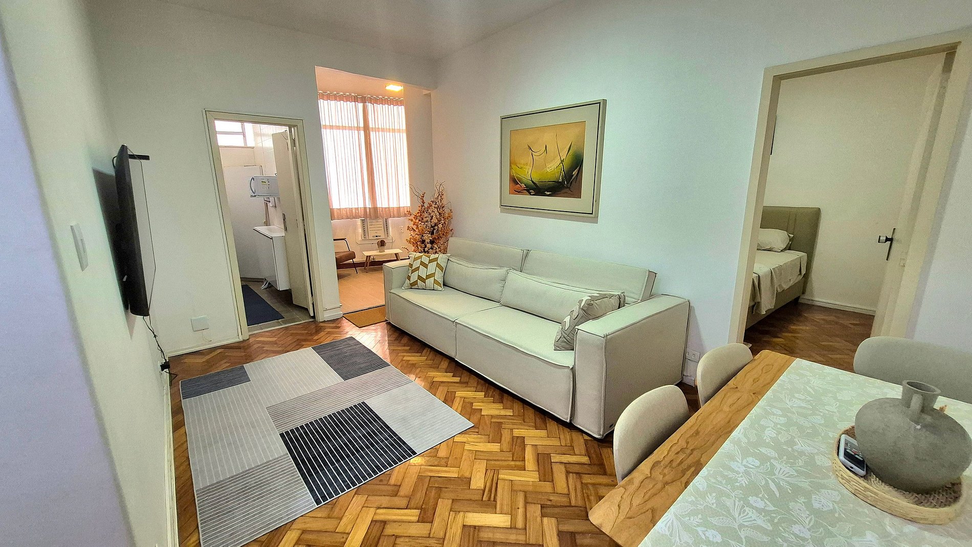 Apartamento recém-reformado, silencioso e a poucos passos da praia de Copacabana, altura posto 5. Sala ampla com sofá cama de casal, mesa para refeições, TV smart e um charmoso jardim de inverno. Quarto com cama de casal, armario, TV smart e ar condicionado. Banheiro moderno e amplo. Cozinha compacta, porem bem equipada. Internet de alta velocidade com wifi. Portaria 24 horas