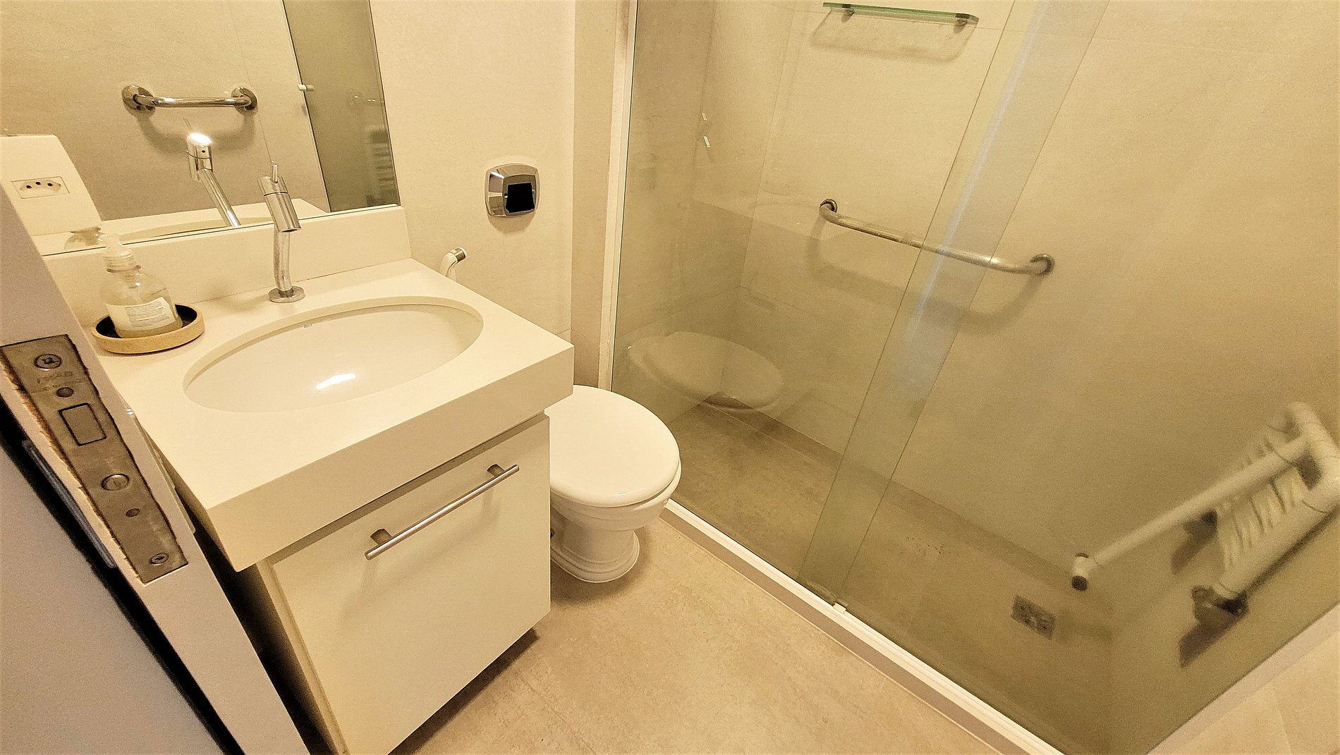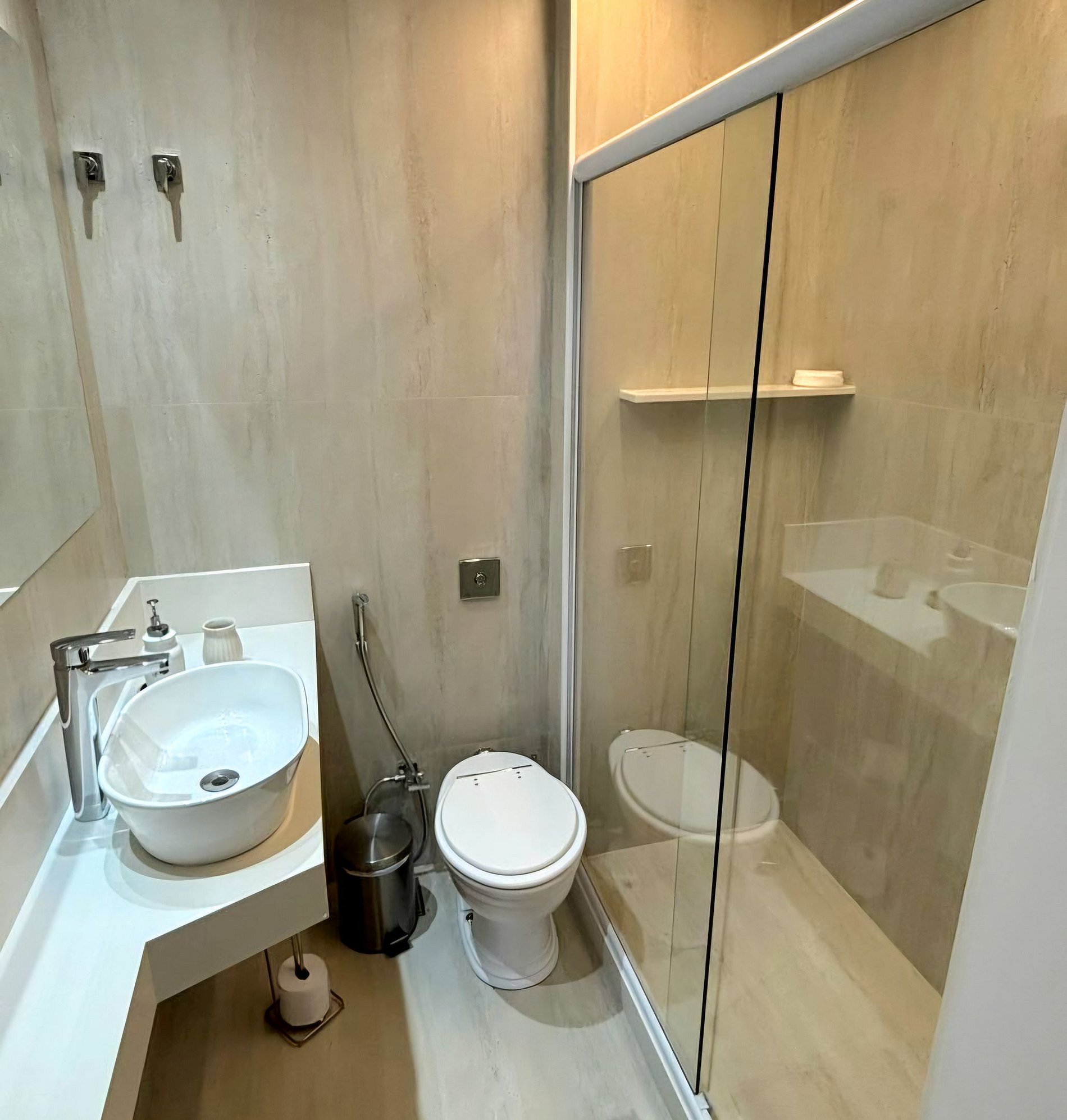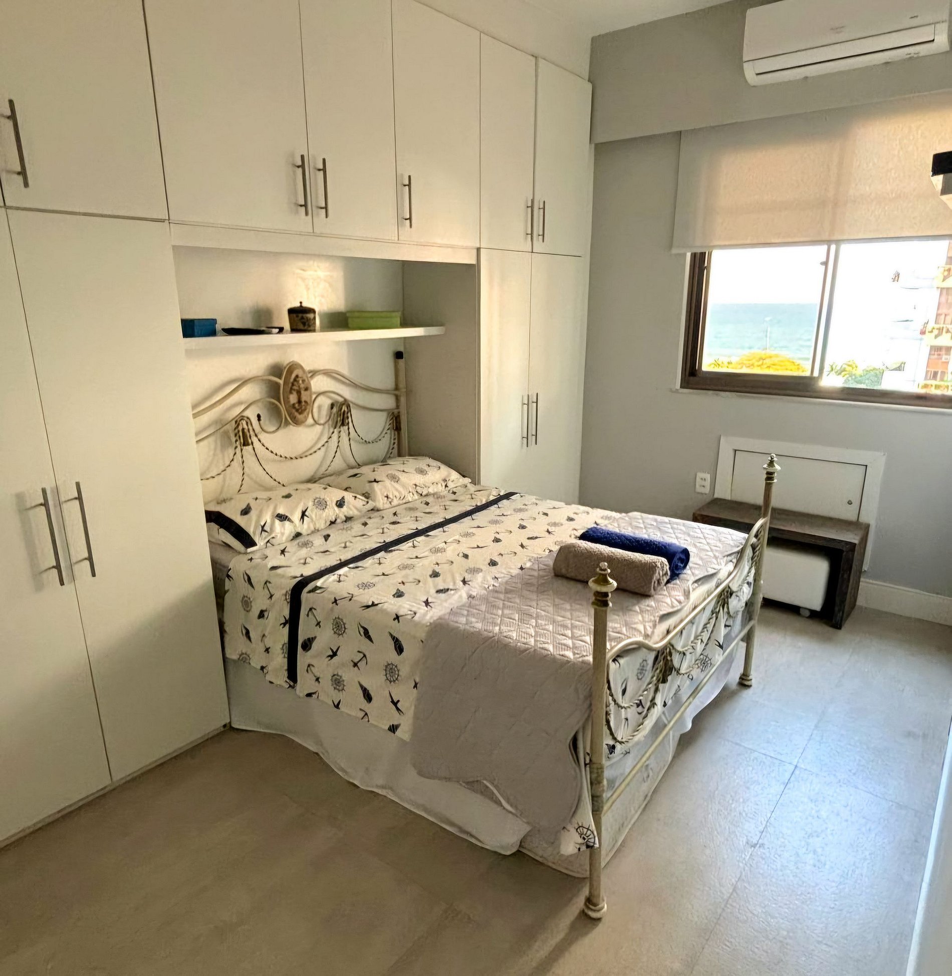 Apartamento reformado com uma linda vista da praia, localizado no condomínio Barramares. Quarto com cama de casal, TV e armários. Sala com sofa cama TV e mesa de jantar. Banheiro completo e cozinha bem equipada com geladeira e microondas. Varanda com mesa para um delicioso café da manhã, apreciando uma bela vista do mar. Ar condicionado na sala e no quarto, TV a cabo e internet de alta velocidade com wifi. Portaria 24 horas e garagem para 1 carro.