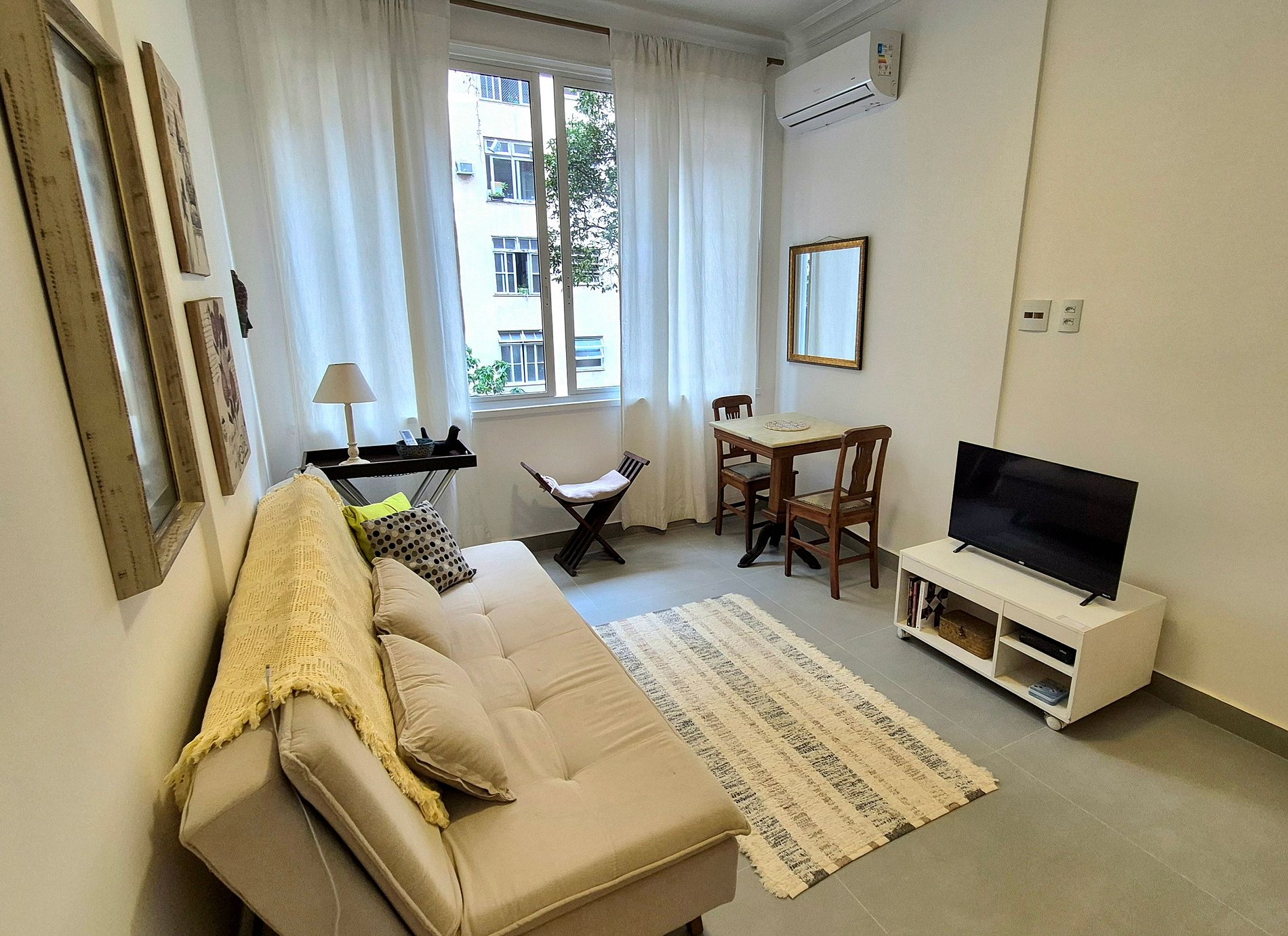 Apartamento claro e arejado apenas 2 quadras das praias de Ipanema, Arpoador e Copacabana. Suite com cama de casal, armário e ar condicionado. Banheiro recém-reformado. Sala de estar com sofa, ar condicionado, mesa para refeicões, TV e internet. Cozinha moderna e bem equipada, com máquina de lavar roupas. Portaria das 07 às 22 horas.