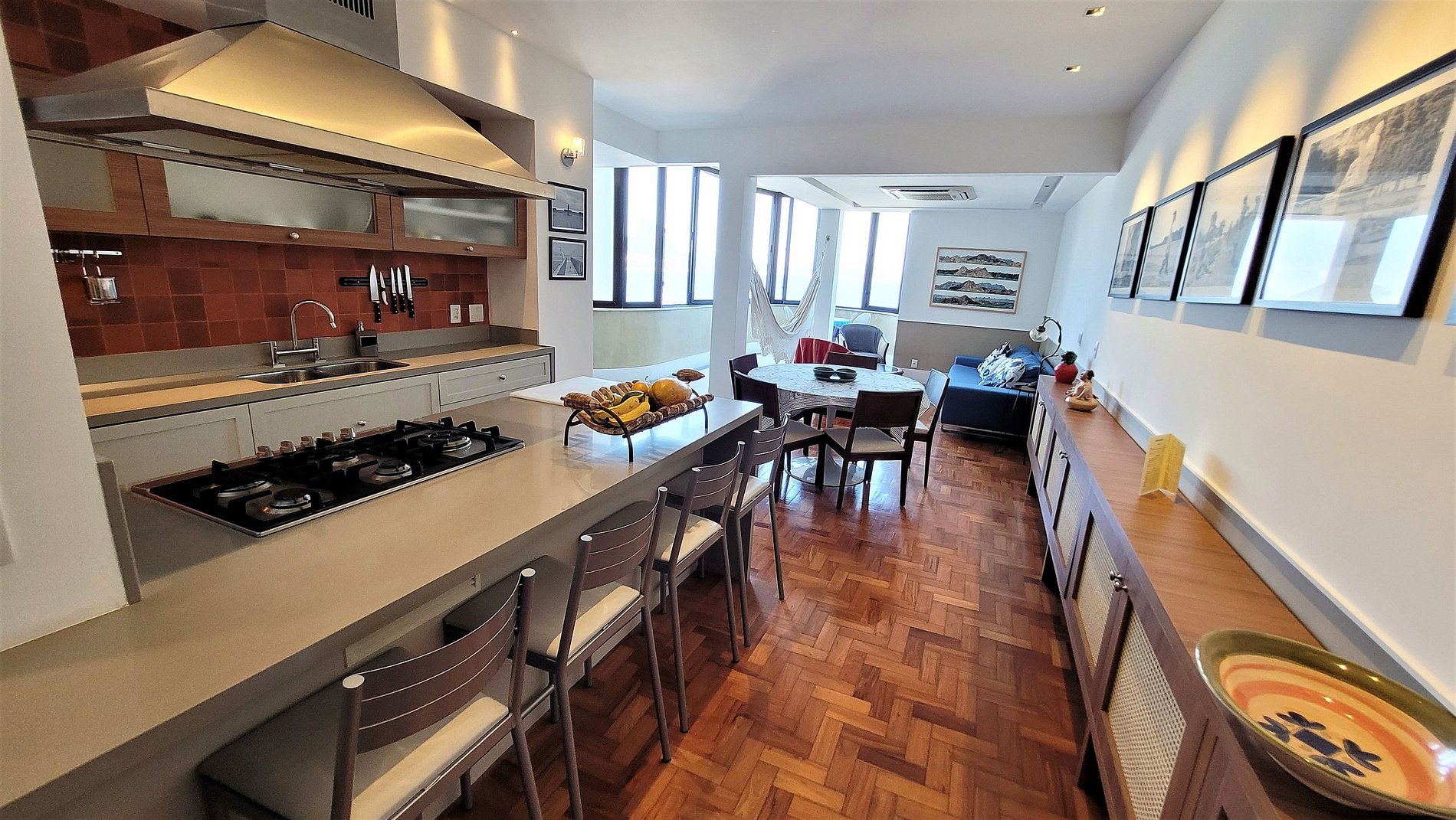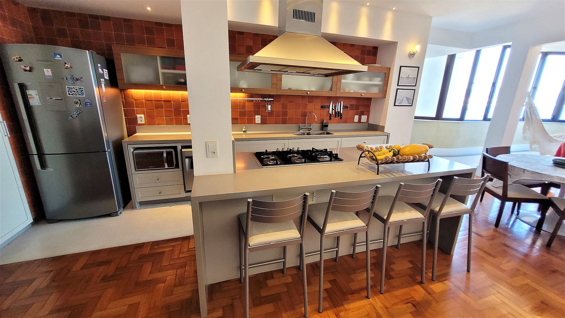 O imóvel é composto por dois quartos, sendo um suite, dois banheiros, ampla sala de estar, mesa de jantar e balcão que acomodam bem até 8 pessoas, sala de TV ou leitura. Ar condicionado em todos os comodos. Cozinha americana moderna e bem equipada. Área de serviço com maquina de lavar roupas. TV a cabo e internet com wifi de alta velocidade.