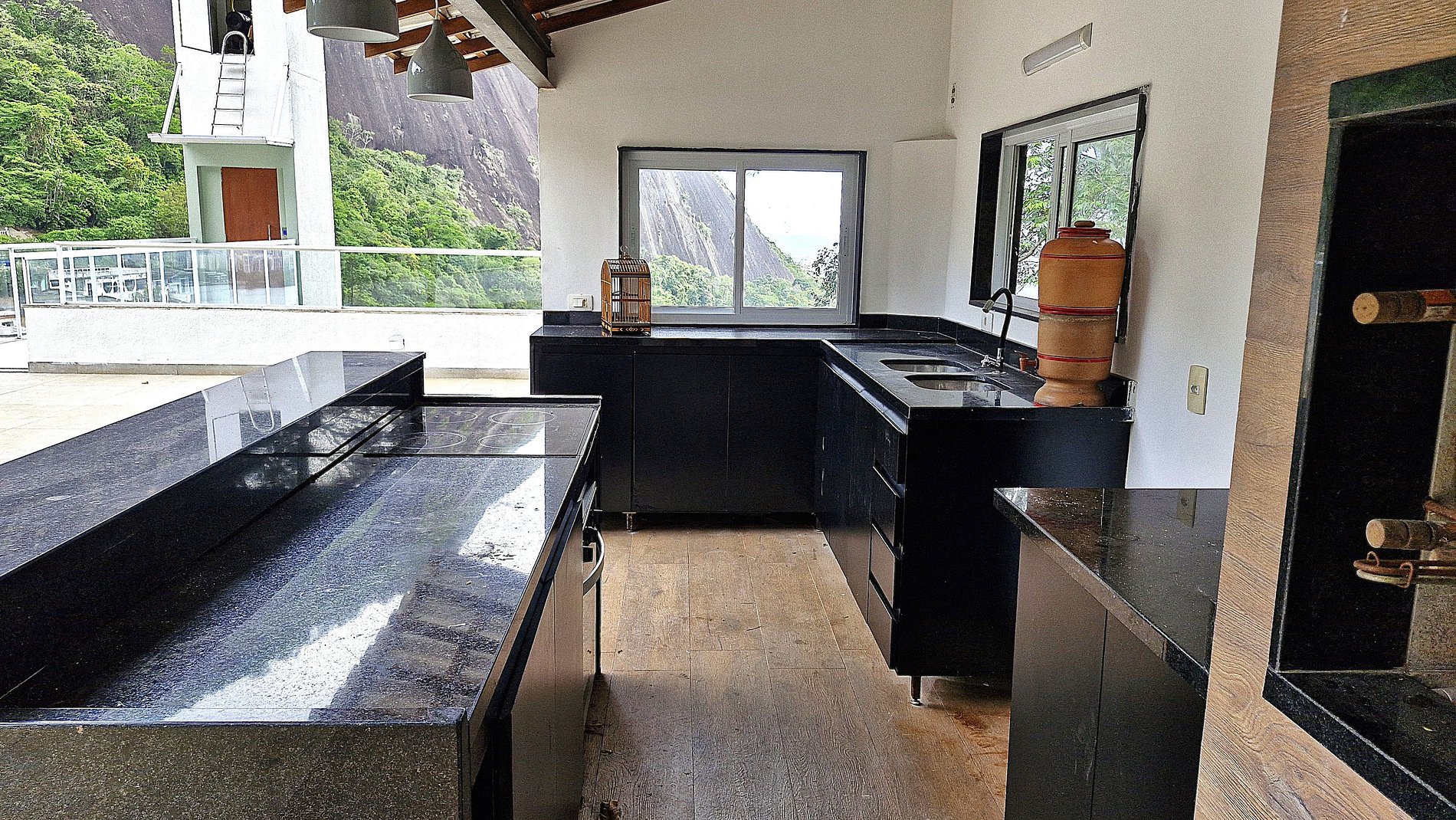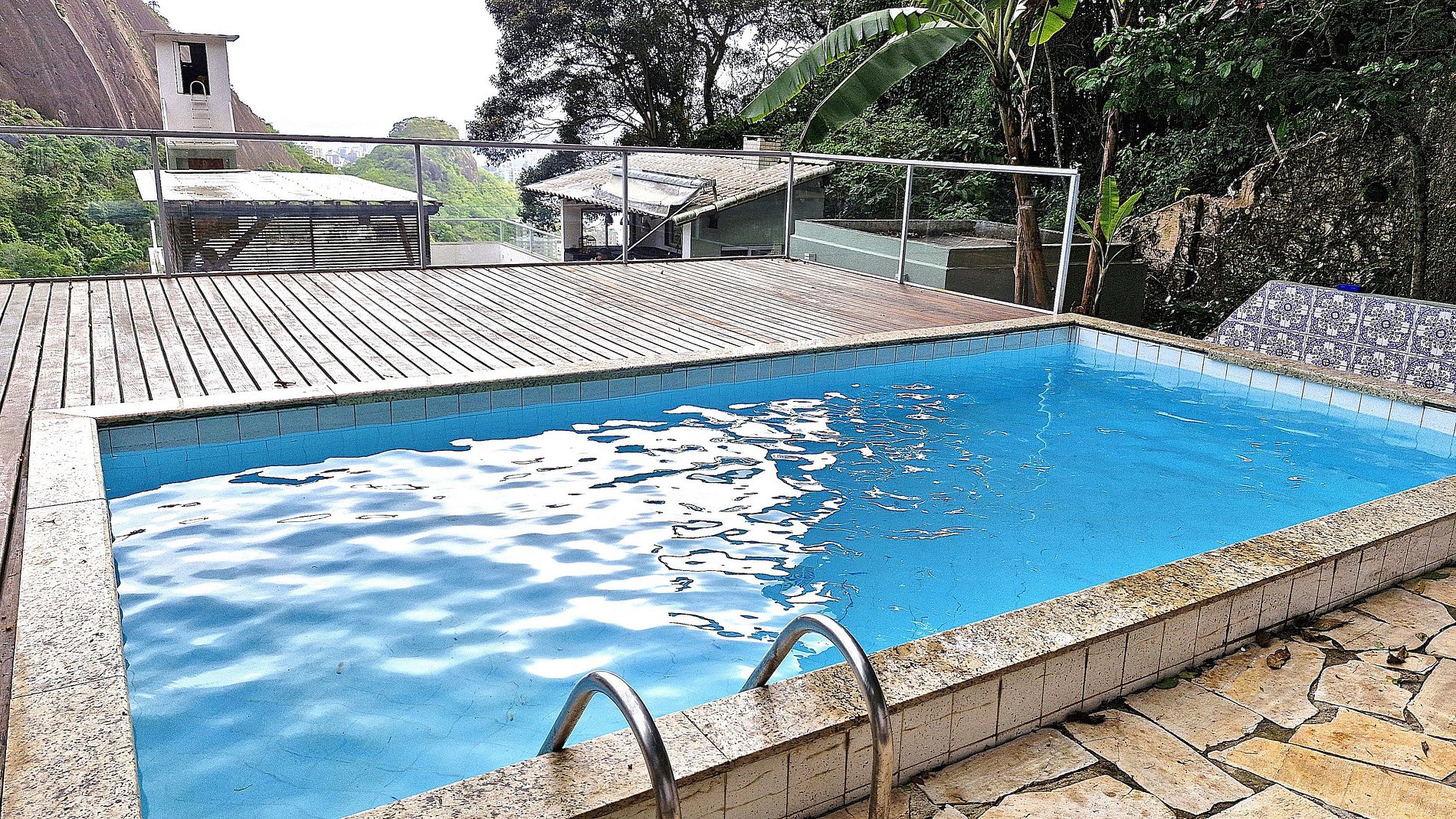 Linda casa com muita privacidade, bela vista para Lagoa e montanha, elevador panoramico, piscina e terraço com churrasqueira e sauna. Sala de estar com sofás, poltronas, ar condicionado e TV. Sala de jantar com lavabo e barzinho.