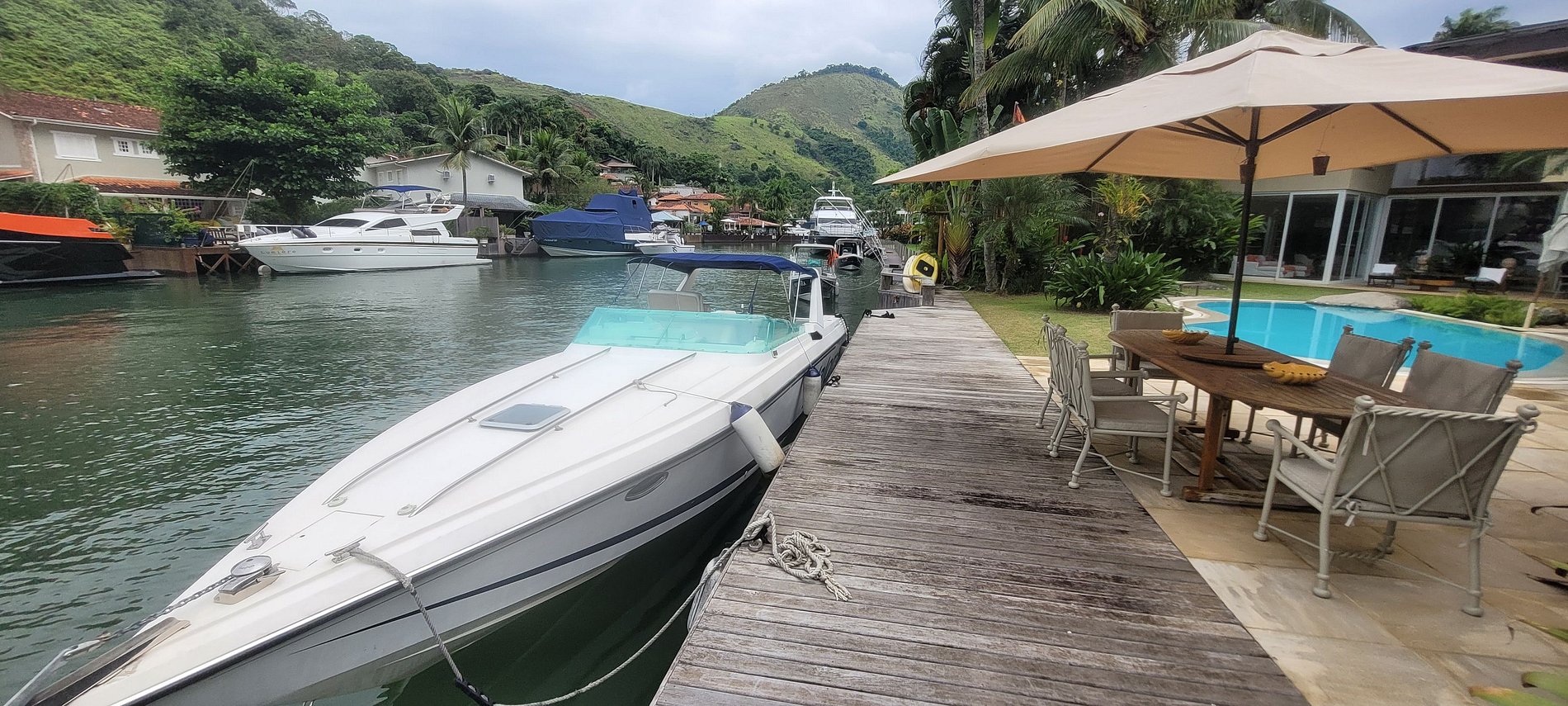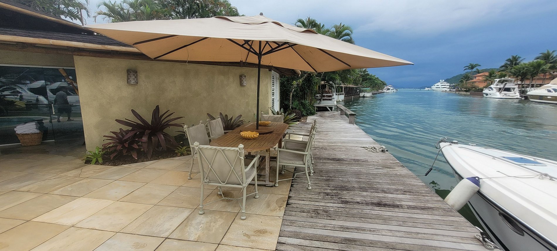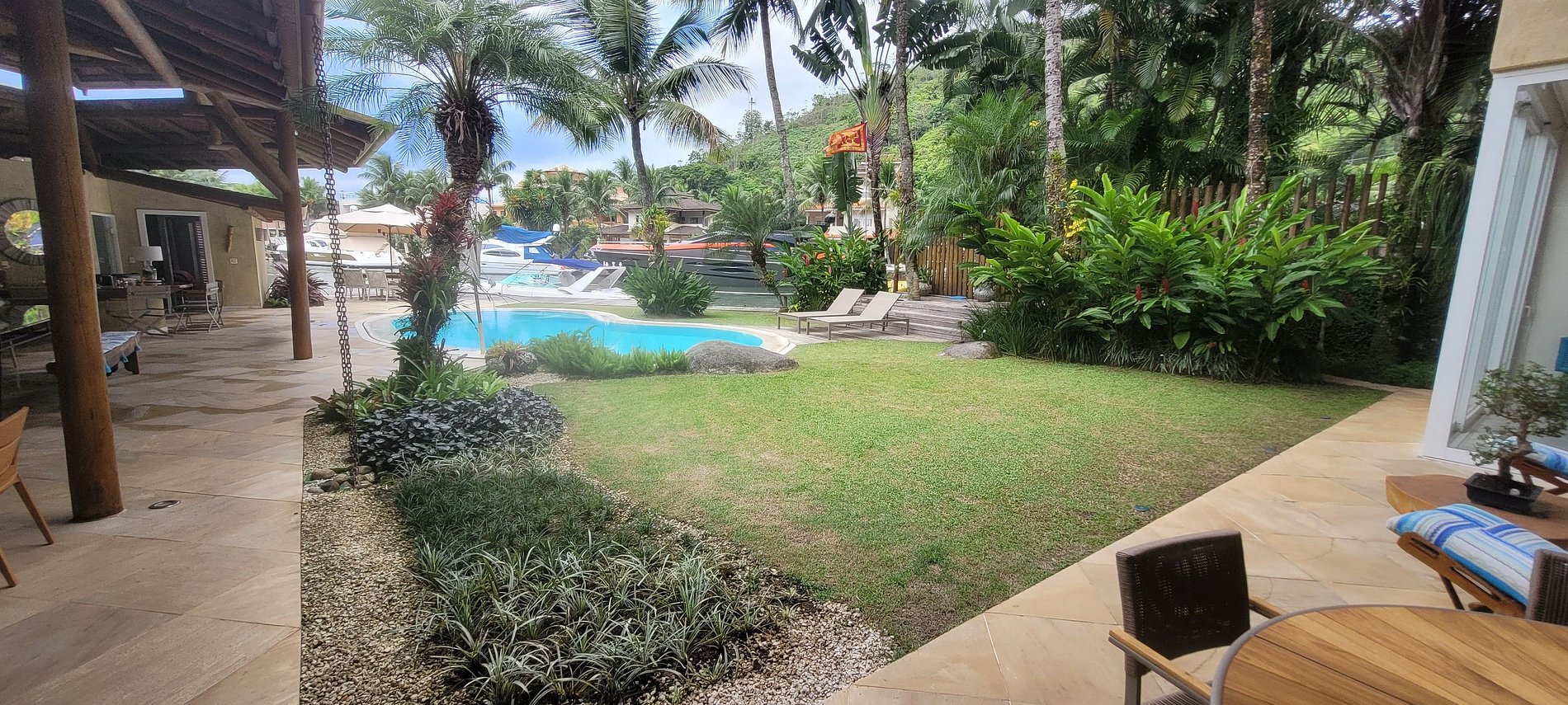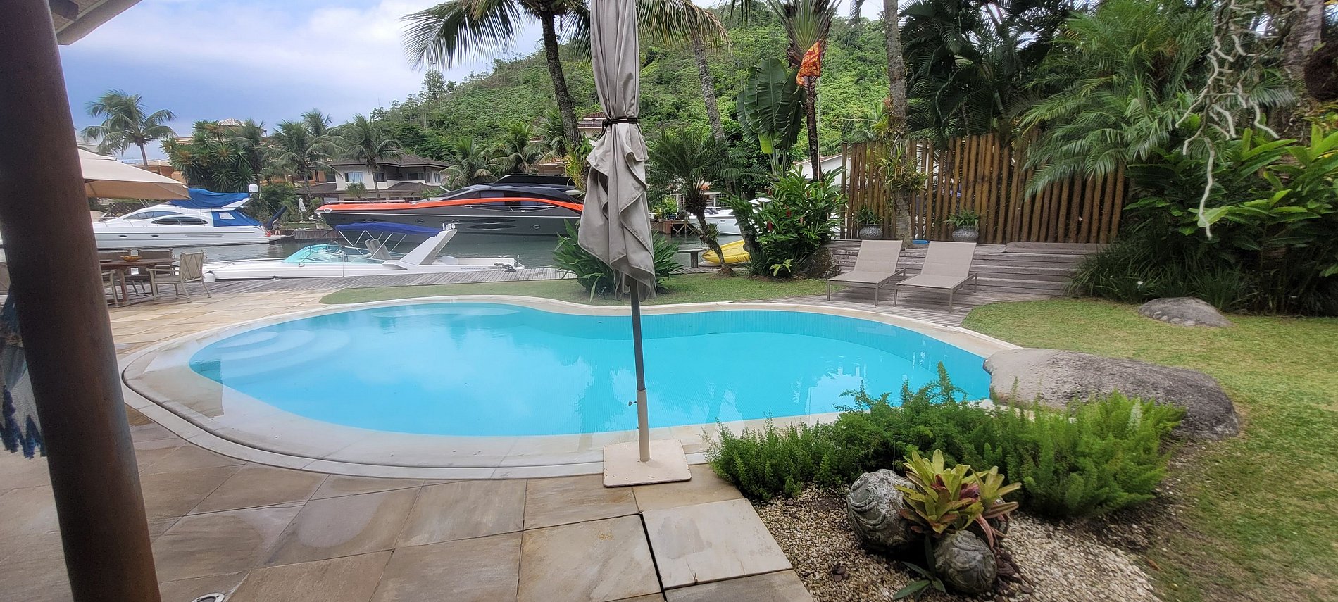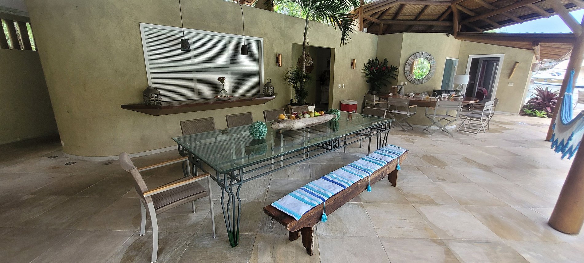 Casa ampla, nova, moderna e bem decorada, com deck e acesso ao mar. Localizada dentro do condominio Porto Frade. Sala de estar, sala de jantar com capacidade para 10 pessoas, area gourmet, churrasqueira, jardim, jacuzzi e piscina. Temos 7 suites muito confotaveis e todas com ar condicionado. Sauna com ducha no jardim. Cozinha completa, com fogão profissional e area de lavanderia com maquinas de lavar e secar. Estacionamento para 4 carros.