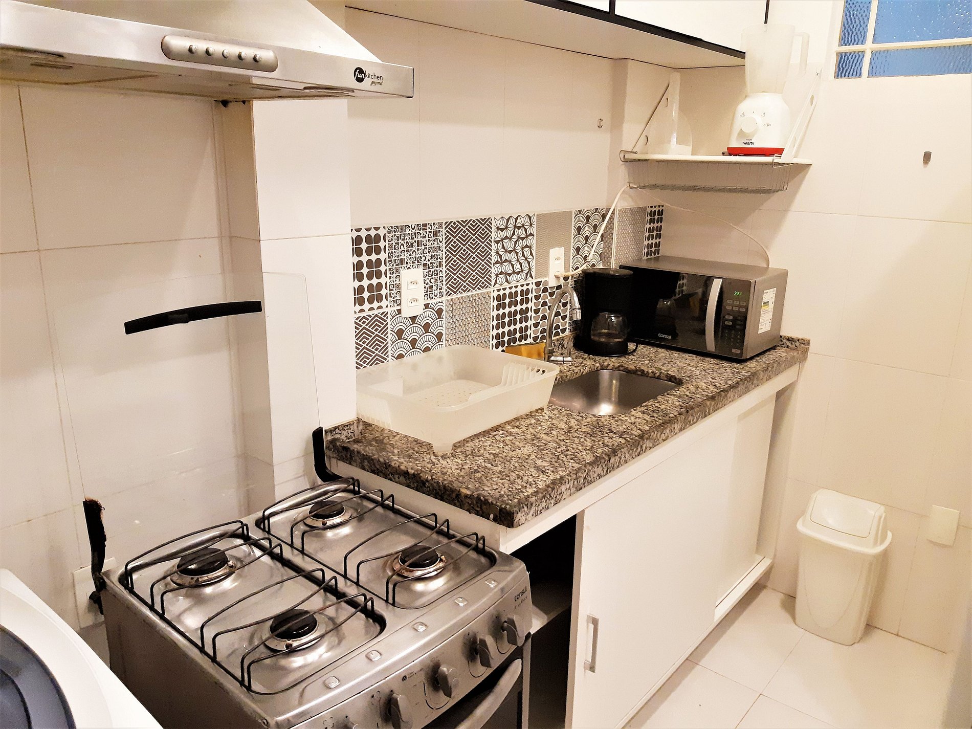 Bright and comfortable apartment for 4 people with beautiful view of Copacabana beach. Room with double bed and sofa bed in the living room for 2 people. Social bathroom + toilet service.  Cable TV + internet with WIFI.